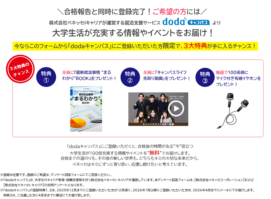 - ※「dodaキャンパス」は、大学生のキャリア教育・就職支援等を行う株式会社ベネッセi-キャリアが運営しています。本アンケート回答フォームは、[株式会社ベネッセコーポレーション]および[株式会社ベネッセi-キャリア]の合同アンケートとなります。