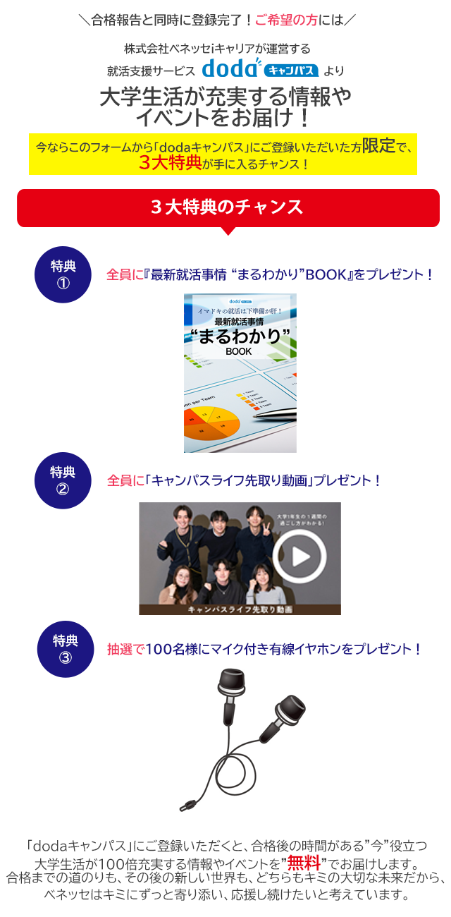 - ※「dodaキャンパス」の登録特典1、2は、2025年12月までにご登録いただいた方は12月頃に、2026年1月以降にご登録いただいた方は、2026年4月までにメールにてお届けします。特典3は、ご当選した方に4月末までに郵送にてお届け致します。